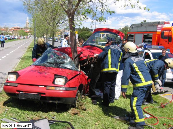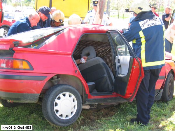 KOPER- V petek, 06.05.2005 ob 14. uri je 48-letni Ljubljančan vozil osebni avtomobil mazda 323 iz koprskega središča proti Semedeli in začel po desnem pasu prehitevati avtomobil, ki je vozil po levem pasu. Po končanem prehitevanju se je hotel vrniti na levi pas, vendar je zaradi neprilagojene hitrosti izgubil nadzor nad vozilom, ki je začelo bočno drseti proti robniku. Dvignilo ga je v zrak in nato je z levim bokom "objel" drevo. Nezavestnega in hudo poškodovanega voznika so iz pločevine izrezali gasilci, reševalci pa so ga odpeljali v izolsko bolnišnico. Zaradi suma, da je vozil pod vplivom alkohola, je preiskovalna sodnica zoper voznika odredila strokovni pregled.