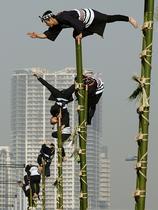 Saj ni res, pa je: tradicionalni japonski gasilci razkazujejo svoje ravnotežne sposobnosti na vrhu bambusovih lestev med novoletno parado gasilske brigade v Tokiu.