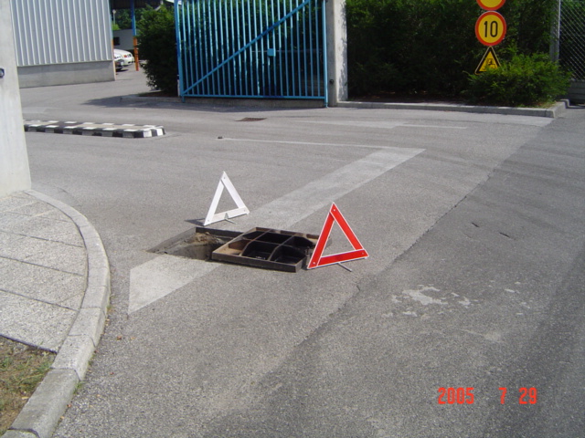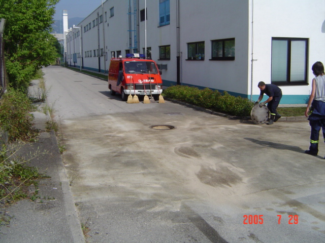 Včeraj 29.7.2005 ob 12.35 smo v GE Nova Gorica dobili preko ReCO sporočilo, da je prišlo v betonarni v okolici Nove Gorice do izlitja hidravličnega olja in da olje odteka v kanalizacijo. Na kraj smo odšli z 2 voziloma 3 gasilci, na mestu smo ugotovili, da je prišlo pri priklopniku med kipanjem do snemanja visokotlačne cevi za olje ki dviga kason. Ugotovili smo tudi, da je tega olja cca 50 litrov. Ko se je cev snela je curek olja odneslo cca 30 m v dolžino in 10 m v širino, kason pa je bil iztegnjen do konca, kar pomeni da ga je (ni bil še prazen) dobesedno zabilo nazaj na kamion (kako nam ni jasno, ker baje bi morala hidravlika imeti varnostni ventil ki bi to preprečil), po besedah očividca je šleper dobesedno dvignilo ko je kason udaril v šasijo. Olje ki se je razpršilo je skozi mejno mrežo pristalo po fasadi stavbe sosednjega podjetja, po avtomobilih ki so bili tam parkirani, po oknih in seveda po cesti, zelenici ter okrasnem grmičevju. Največ je bila pošpricana fasada stavbe ki je bila vzporedna s smerjo curka in delno stena ki je bila pravokotno. Po prihodu na kraj smo takoj preprečili rahlo iztekanje v kanalizacxijo in takoj pričeli z posipavanjem in pivniki. Intervencija je bila zelo naporna ker je sonce neverjetno žgalo in smo bili primorani delati pavze. Ob 14.45 so nam priskočili na pomoč pri pometanju in čiščenju OIL DRY-ja še PGD Nova Gorica z 5 gasilci. Samega OIL DRY-ja je bilo porabljenega cca 250 kg + cca 40 pivnikov. Sama sanacija tega madeža ki je nastal na vozišču pred stavbo je trajala do 16.45 ko smo zadevo zaključili. Slikce sledijo.