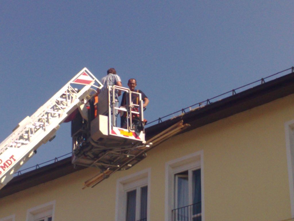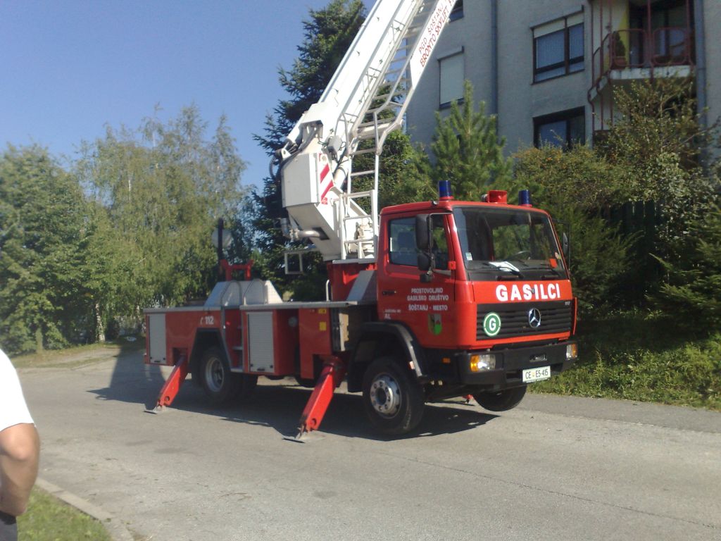 Ekipo GZ Velenje so razdelili na dva dela, skupaj smo ostali gasilci Velenja, Šoštanja, Pesja in Vinske gore z GVM-1 in ALP. Naša prva naloga je bila na stanovanjskem bloku, vendar je bila ALP prekratka in delo ne bi bilo varno, prav tako je bila streha bloka zelo strma, k sreči so bile poškodbe ( luknje ) na strehi prekrite " s pur peno " zato smo odšli na drugi kraj :roll: