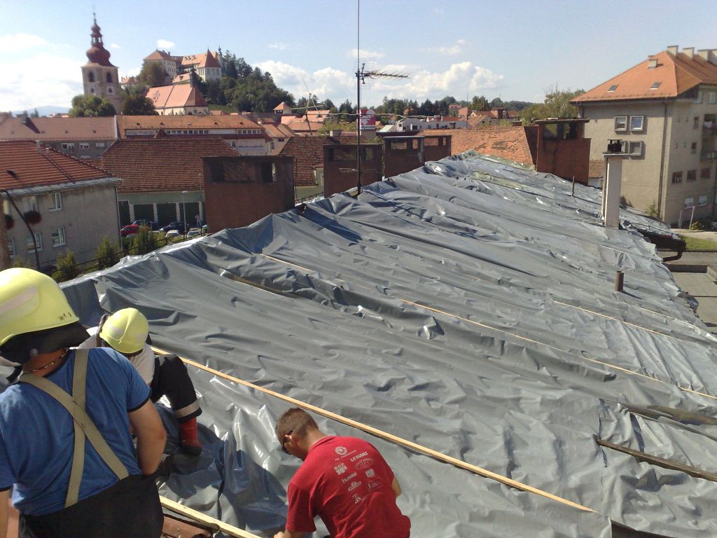 V ponedeljek smo bili v okolici Ptuja tudi gasilci GZ Novo mesto (PGD Dolž, Stopiče, Smolenja vas in Šmihel NM, skupaj 14 gasilcev) in GZ Trebnje. S folijo smo prekrivali strehe v občini Destrnik.