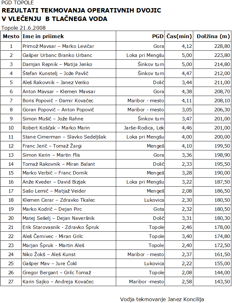 - dosežena dožina pri polaganju tlačnega voda v metrih in centimetrih (meri se do položaja zadnjega dela telesa tekmovalca, ki ga je dosegel ob zaustavitvi)
