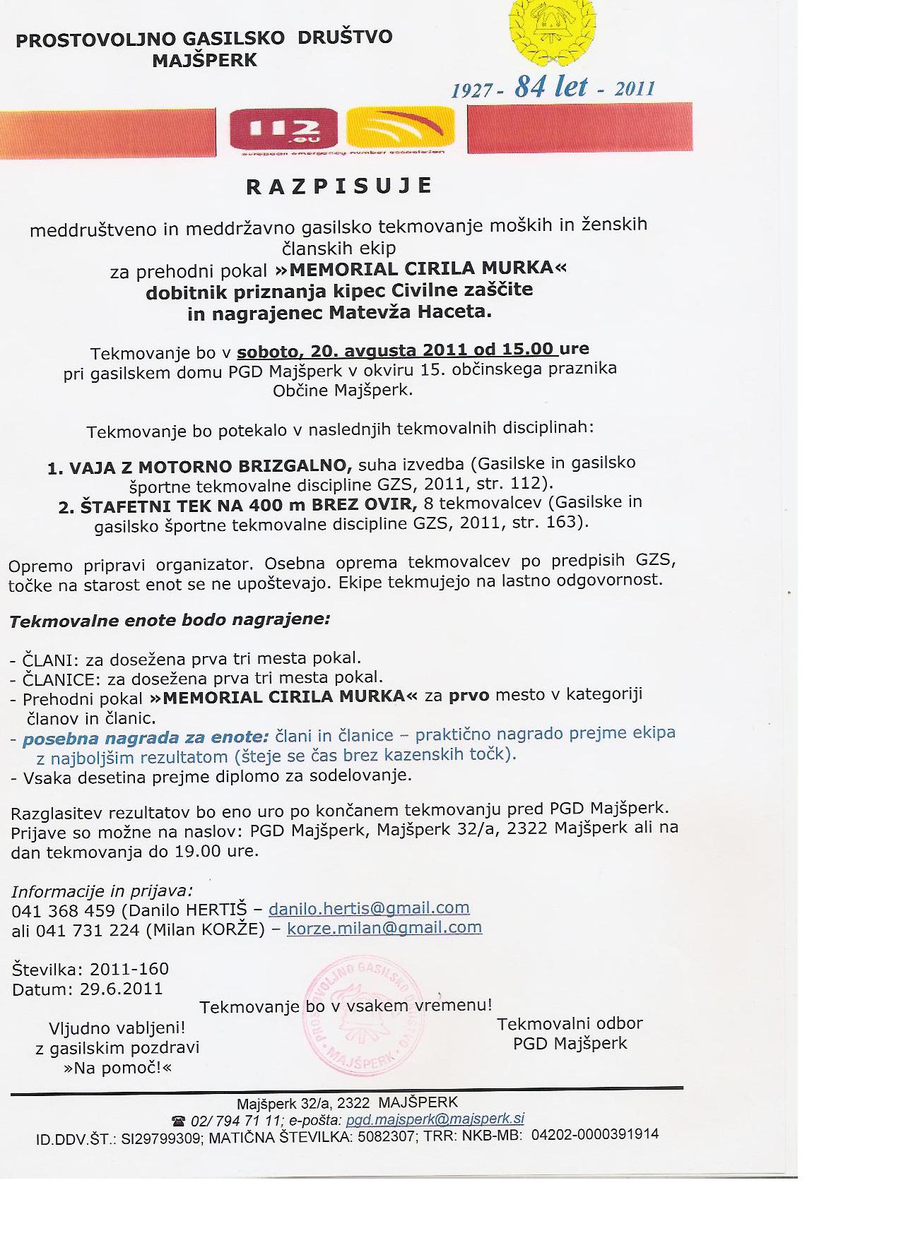 17. TRADICIONALNO MEDDRUŠTVENO TEKMOVANJE ČLANOV, ČLANIC IN VETERANOV ZA MEMORIAL »DANIELA KRESLINA«, KI BO V SOBOTO 16.07.2011 S PRIČETKOM OB 15.00 URI PRI GASILSKEM DOMU NA DOLNJI BISTRICI