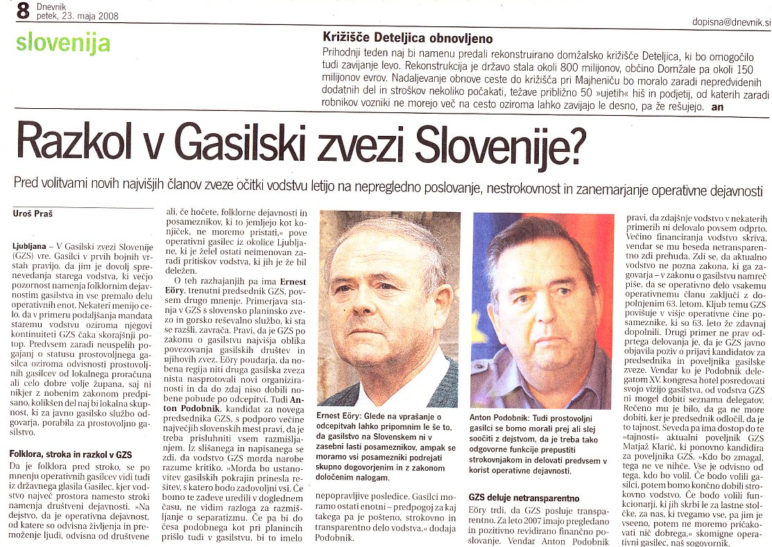 Članka v Dnevniku nisem bral in ga tudi ne bom, ker se mi ne ljubi (ne zdi vredno) kupiti časopisa. Škoda je le, da gasilci peremo svoje umazano perilo po časopisih. To kaže na nemoč organizacije, da v svojih vrstah uredi stvari. Res je le to, da če se neka (morda v začetku) zanemarljiva slabost ne ozdravi pravočasno je treba kasneje morda poseči tudi po amputaciji.